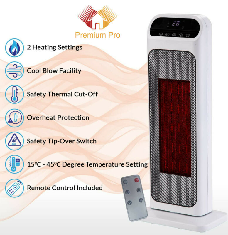 Ceramic PTC Fan Heater Tower Remote Control 2 Heat Settings Timer 2kW