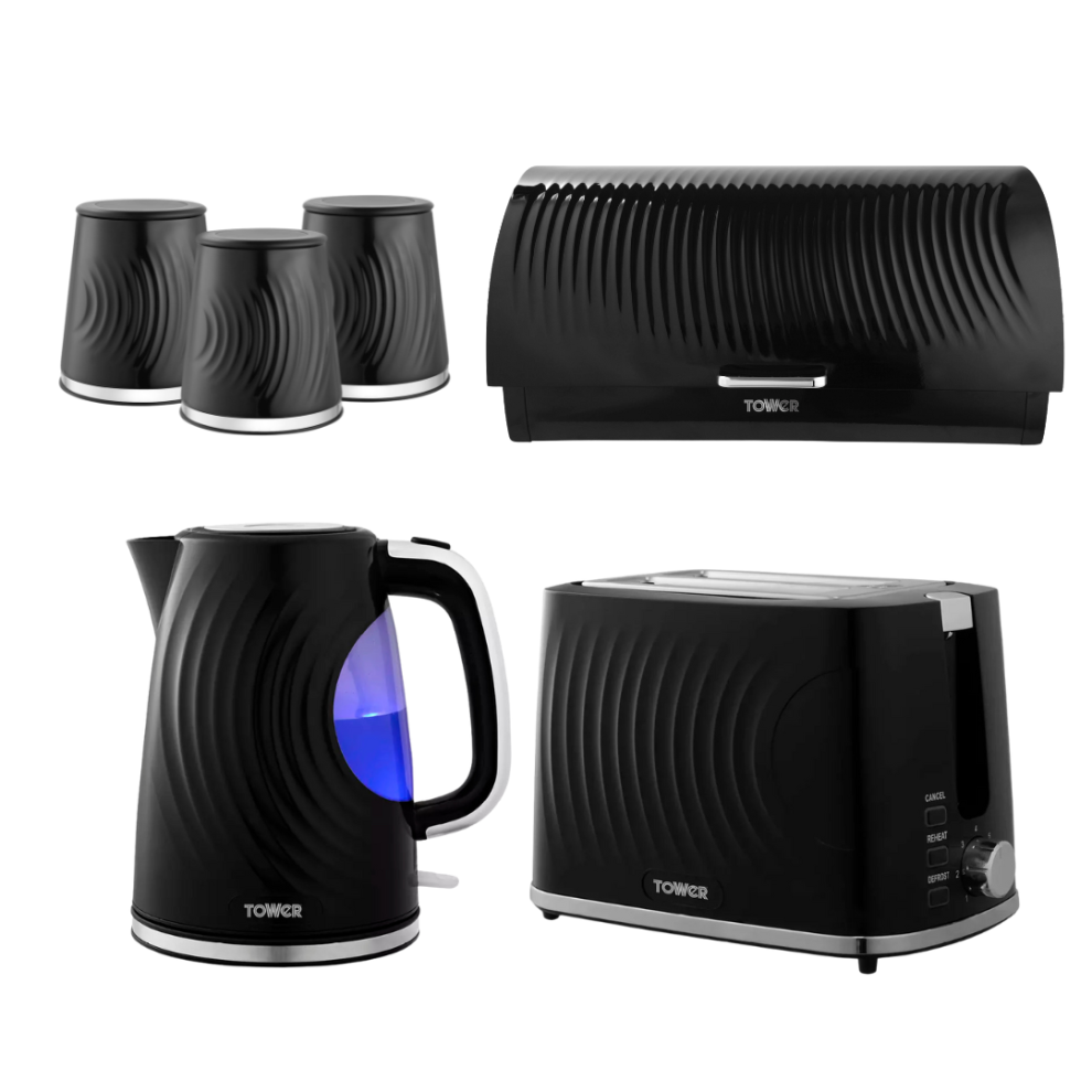 Tower Sonar Black Kettle Toaster Bread Bin Canisters Matching Kitchen Set