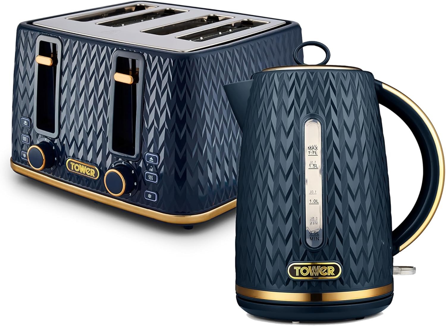 Tower Empire Kitchen Set, 1.7L Rapid Boil Kettle and 4 Slice Toaster, Midnight Blue with Brass Accents EEJB325