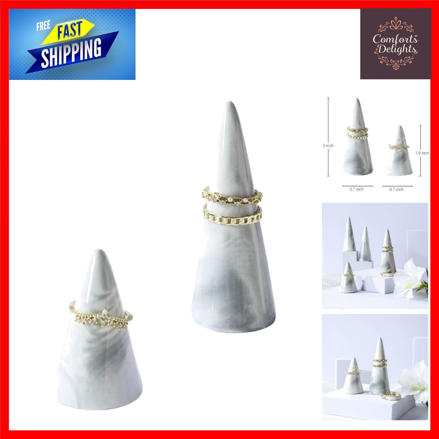 Elegant Marble Ring Holder Tower Cone Shape Jewelry Display Stand 2 PC Set Grey