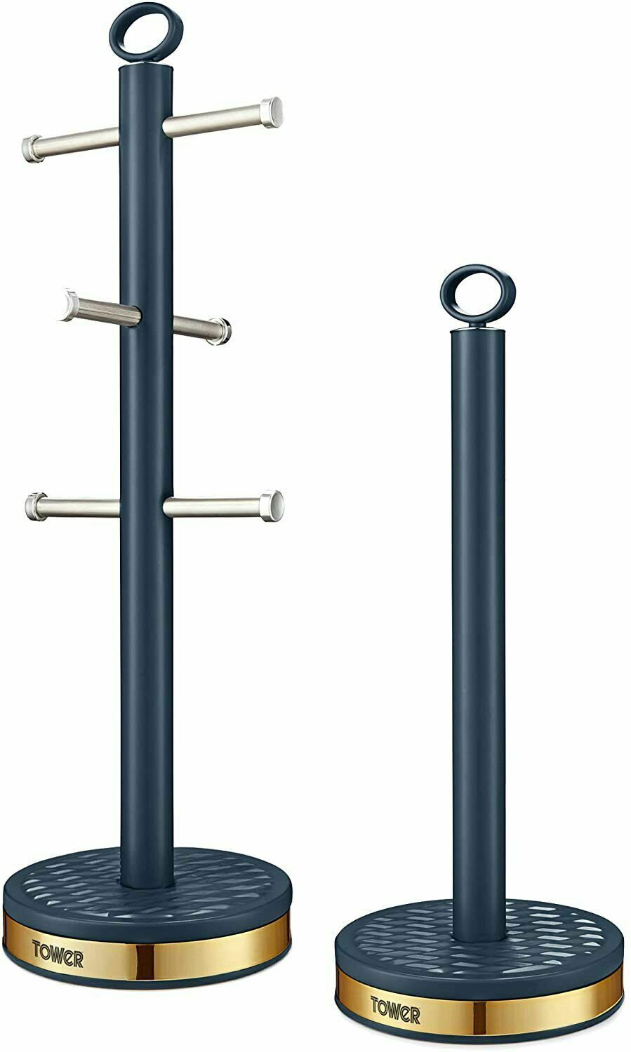 Tower T826092MNB Empire Mug Tree and Towel Pole Set, Stainless Steel, Anti-Slip, Midnight Blue and Brass