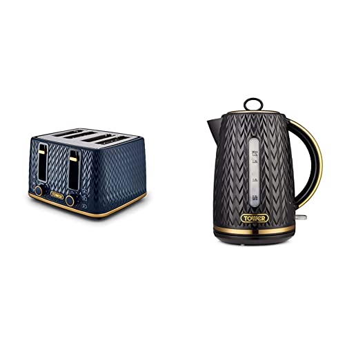 Tower T20061BLK Empire 4-Slice Toaster with Defrost/Reheat, Removable Crumb Trays, 1600W, Midnight and Brass & T10052MNB Empire 1.7 Litre Kettle with Rapid Boil, Removable Filter, 3000 W