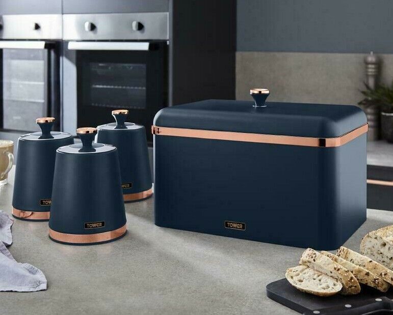 Tower Empire Bread Bin & Canister Set Midnight Blue & Brass Kitchen Storage Set