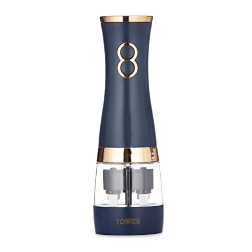 Tower T847004MNB Electric Salt and Pepper Mills, Battery Operated with Adjustable Ceramic Grinders, Midnight Blue and Rose Gold