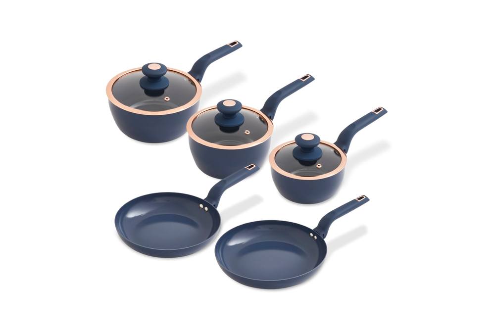 Tower T800232MNB Cavaletto 5 Piece Cookware Set with 16cm, 18cm, 20cm Saucepans and 24cm, 28cm Non-Stick Frying Pans, Midnight Blue & Rose Gold