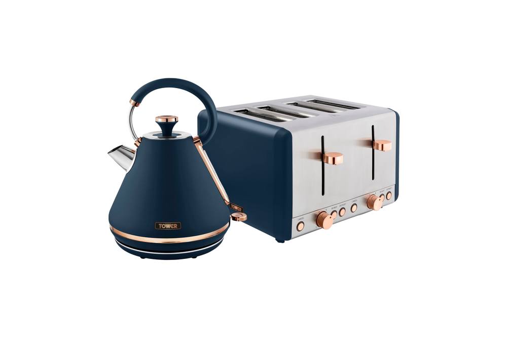 Tower T20051MNB Cavaletto 4-Slice Toaster with Defrost/Reheat & T10044MNB Cavaletto Pyramid Kettle with Fast Boil, Detachable Filter, 1.7 Litre, Midnight Blue and Rose Gold
