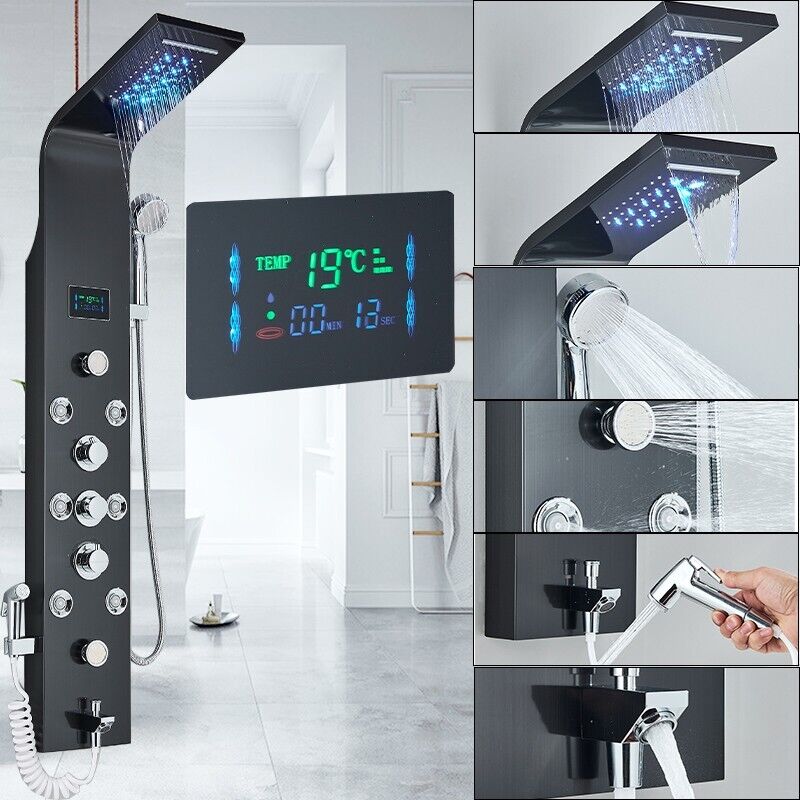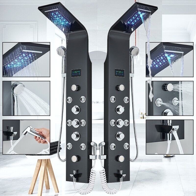 Black Shower Panel Column Tower LED Stainless Steel Body Jet Waterfall Mixer Tap