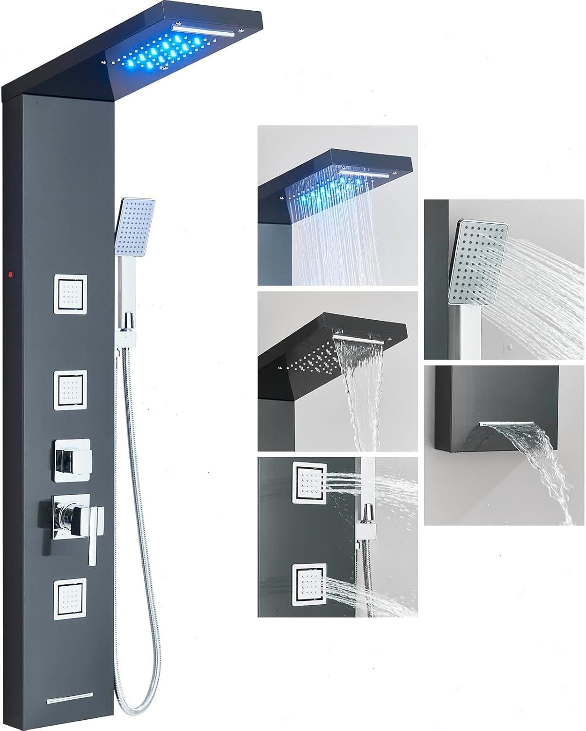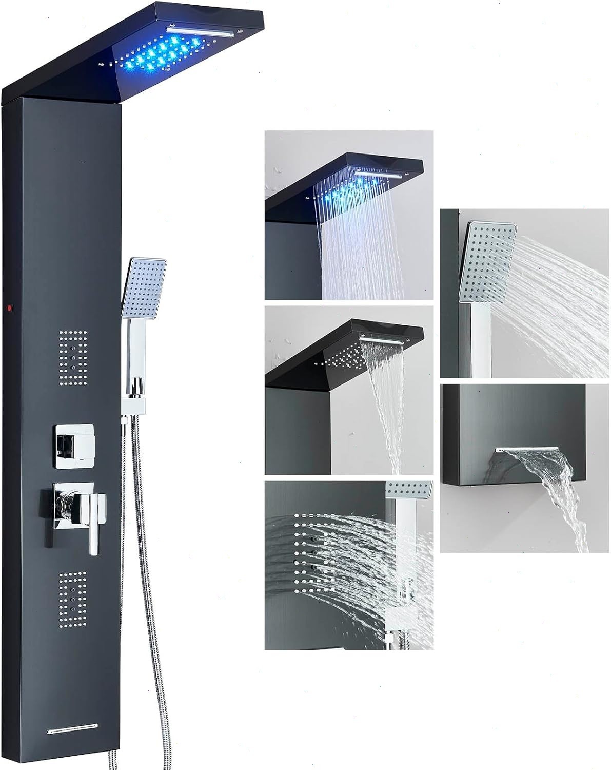 Black LED Shower Panel Column Tower Stainless Steel Body Jet Waterfall Mixer Tap