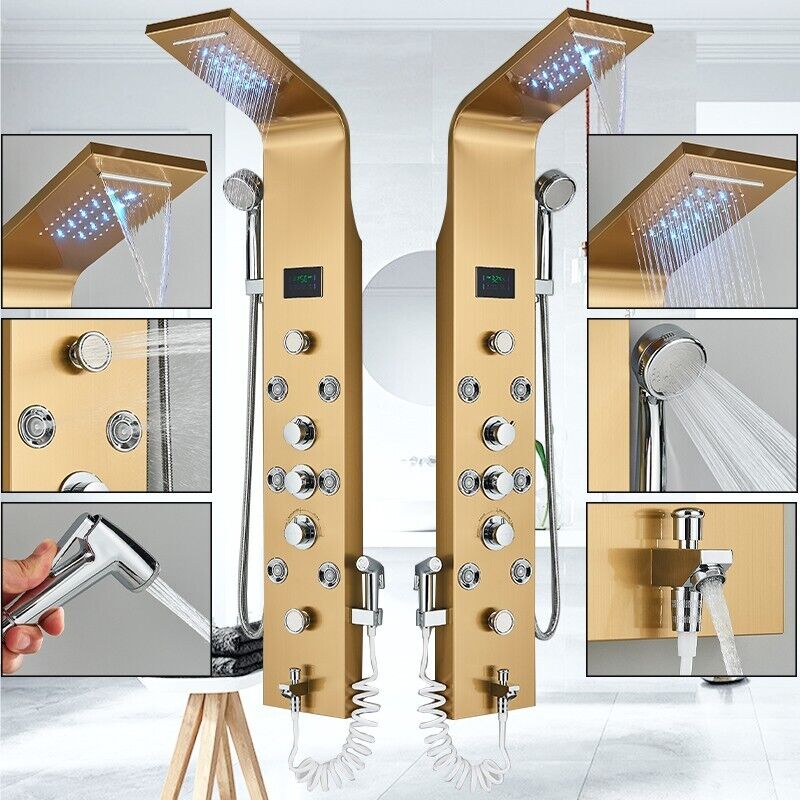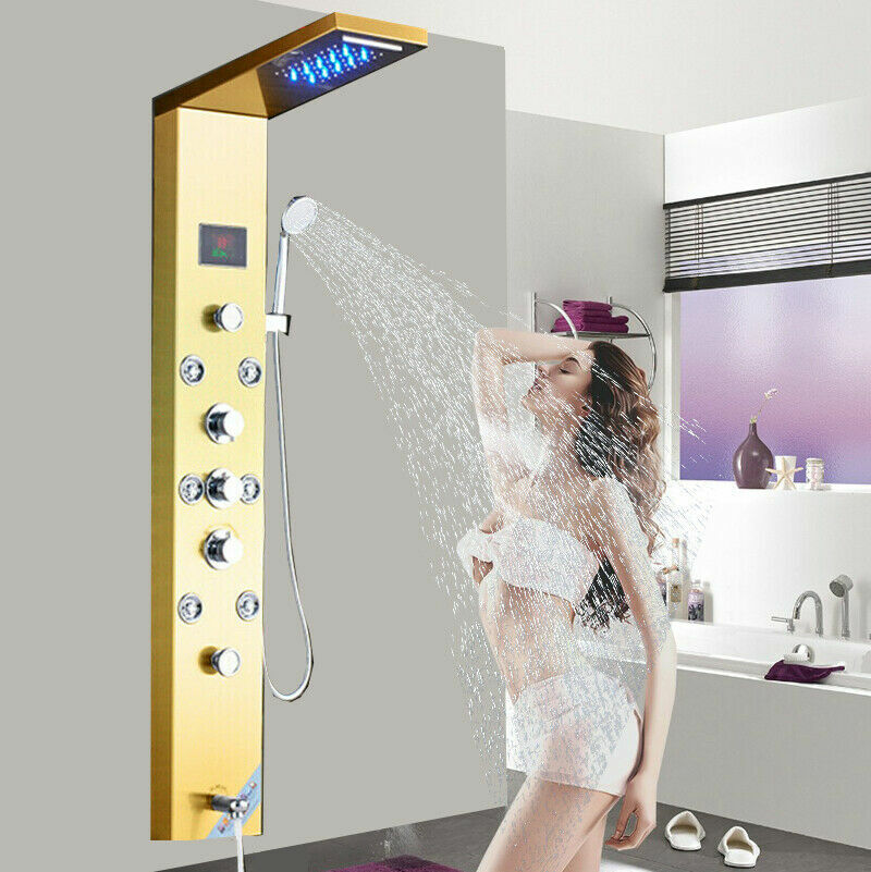 Stainless Steel LED Shower Panel Column Tower Gold Mixer Tap Massage Body Jets