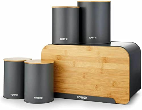 Tower T826140GRY Scandi 5 Piece Bamboo Storage Set with Bread Bin, Biscuit Barrel, Canisters, Grey