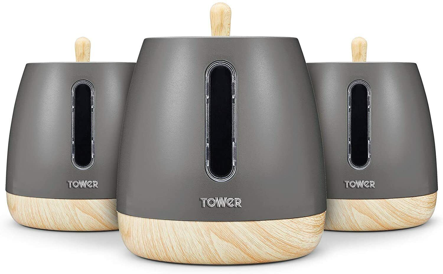 Tower T826031G Scandi Set of 3 Canisters, Grey with Wood Effect - Brand New