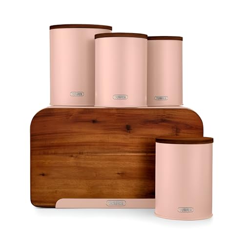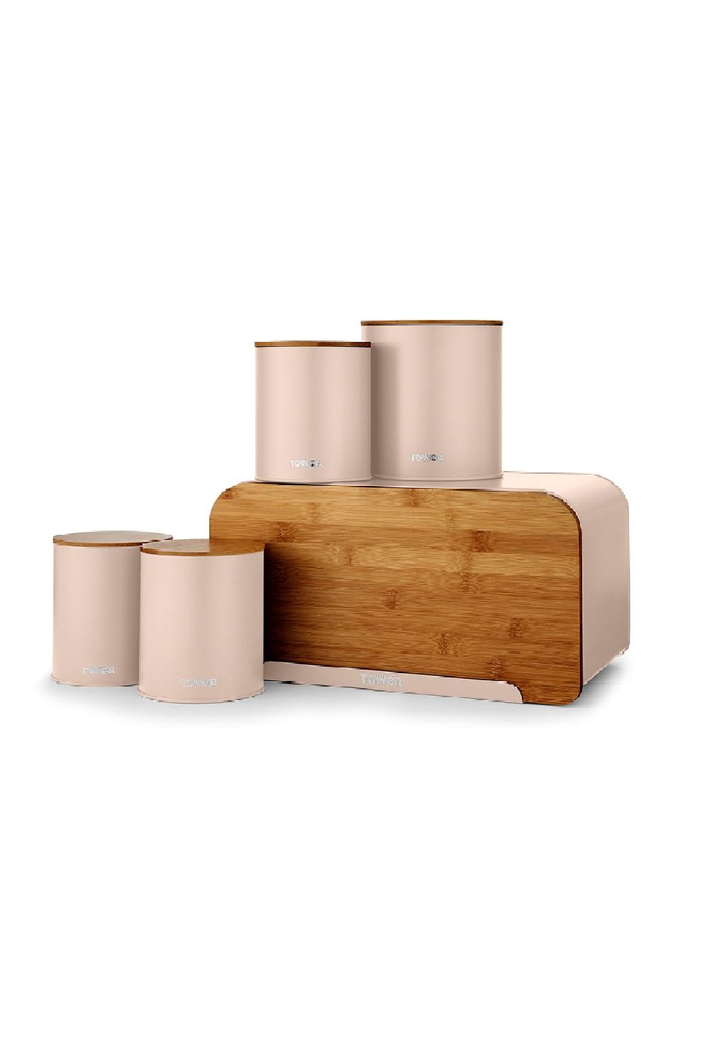 Tower T826140PCLY Scandi 5 Piece Acacia Wood Storage Set with Bread Bin, Biscuit Barrel, Canisters, Pink Clay
