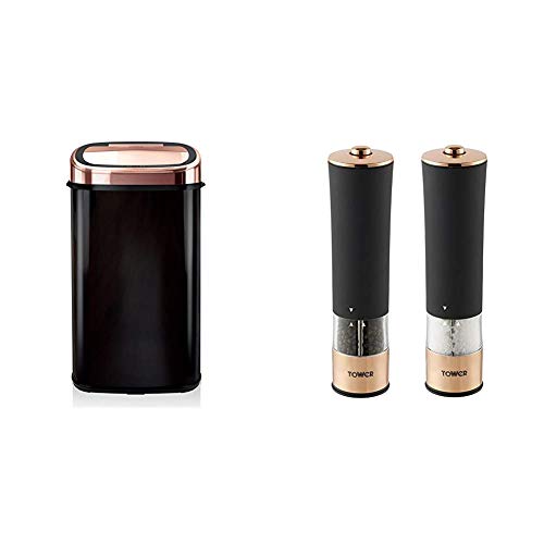 Tower Square Sensor Bin with Infrared Technology, Stainless Steel Black and Rose Gold, 58 Litre & Electric Salt and Pepper Mill, Stainless Steel, Soft-Touch Body, Rose Gold and Black