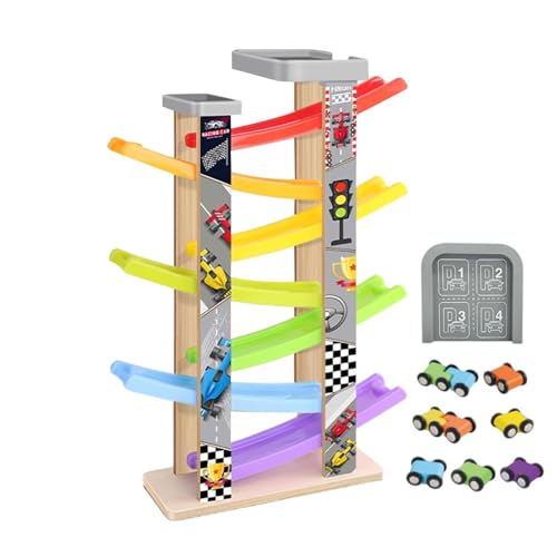 LUCKDANO Car Ramp Toy Wooden Car Ramp Toy - Colorful Educational for Toddlers - Improves Hand Eye Coordination with 6 Ramps - Ideal for Infants