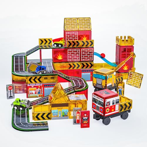 Magnetic Tiles for Kids - Magnetic Road Tiles & Fire Station Construction Toy, Magnetic Building Blocks with a Telescopic Crane, Roads & Cars, For 3+ Year Olds Boys and Girls Gift