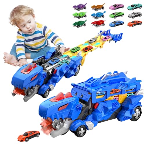 TERRAMUS Dinosaur Toys for 3 4 5 6 Year Olds Boys Gifts, 3-In-1 Ejection Folding Transport Truck with 8 Race Cars for 3 4 5 6 Year Olds Kids, Portable Dinosaur Toy with Sound, Best Gift Vehicles Set
