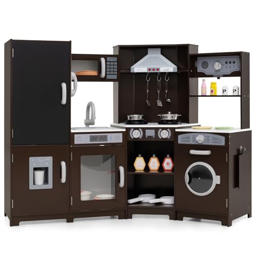 Kids Corner Kitchen Playset, Wooden Play Kitchen with Washing Machine, Range Hood, Ice Maker, Microwave, Oven, Sink, Little Chef Pretend Cooking Toy Set for Toddler (Brown)