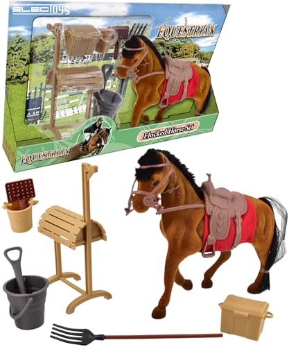 Electoys Toy Horse with Equestrian Accessory Set for Imaginative Outdoor Play Brown Flocked Animal Figure Grooming Stable Kit Role Play for Children Encourages Creativity - 4 Pack