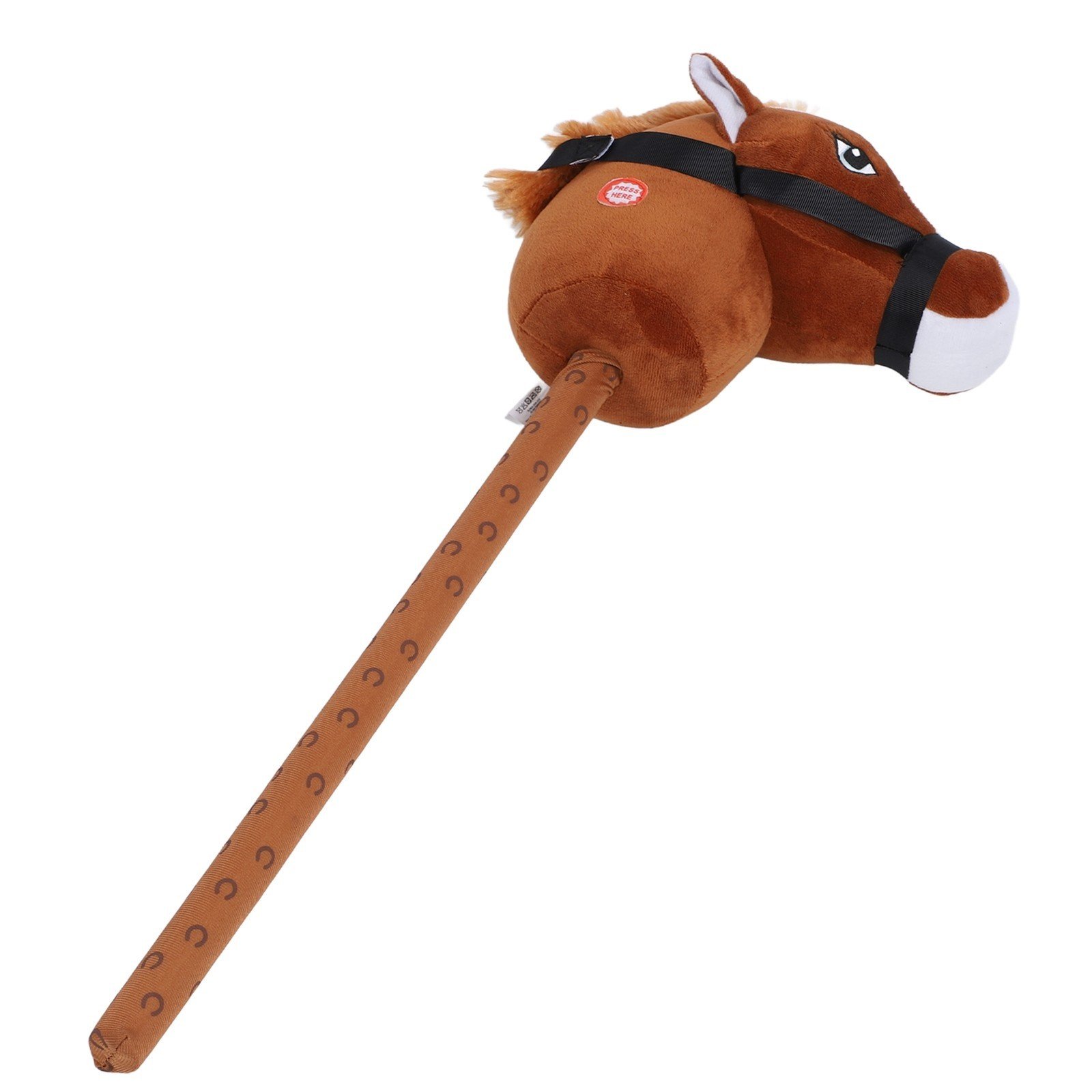Fockety 28in Riding Stick, Outdoor Stick Horse with Wood Wheels Real Pony Neighing and Galloping Sounds Plush Toy Horse with Sound Toy (Dark Brown)