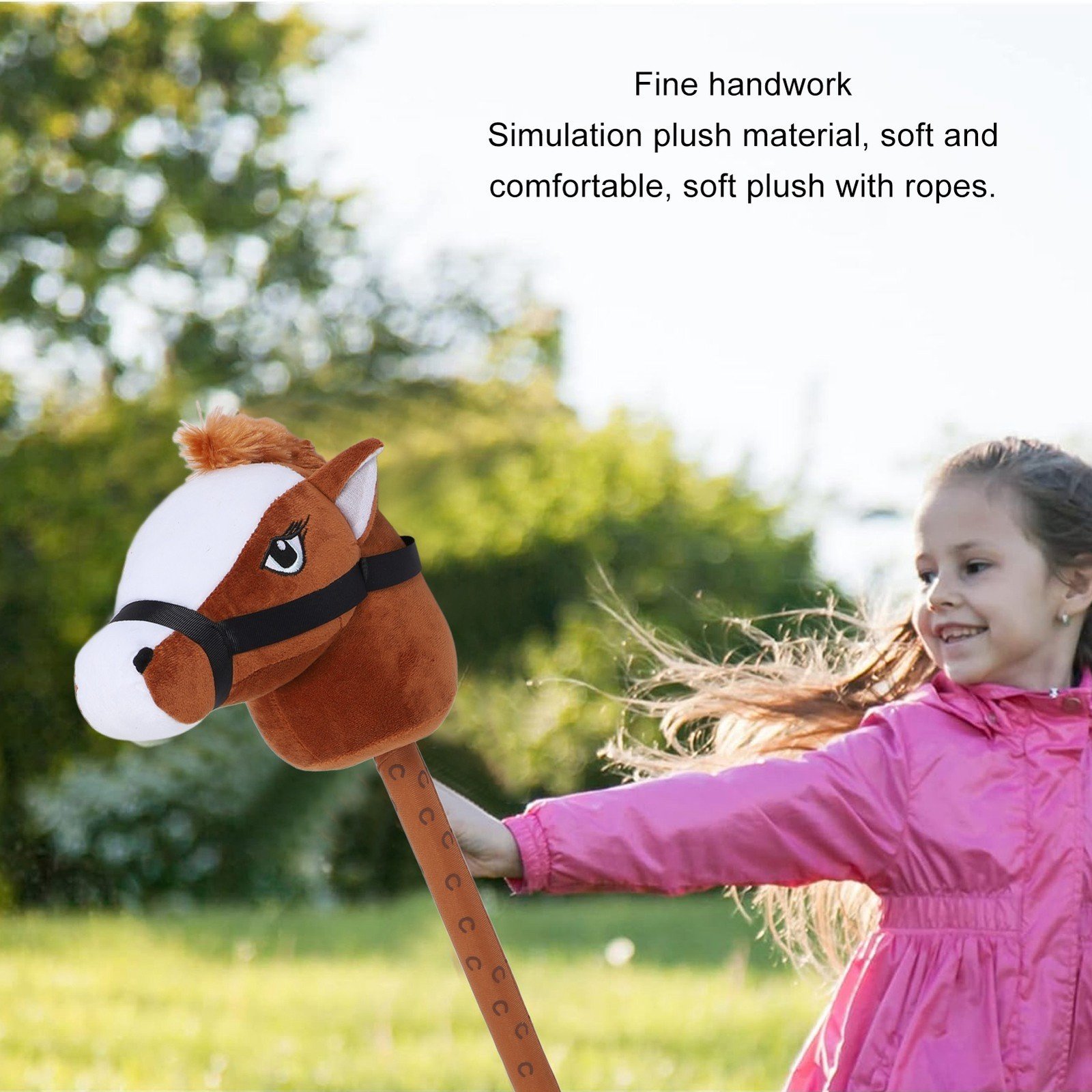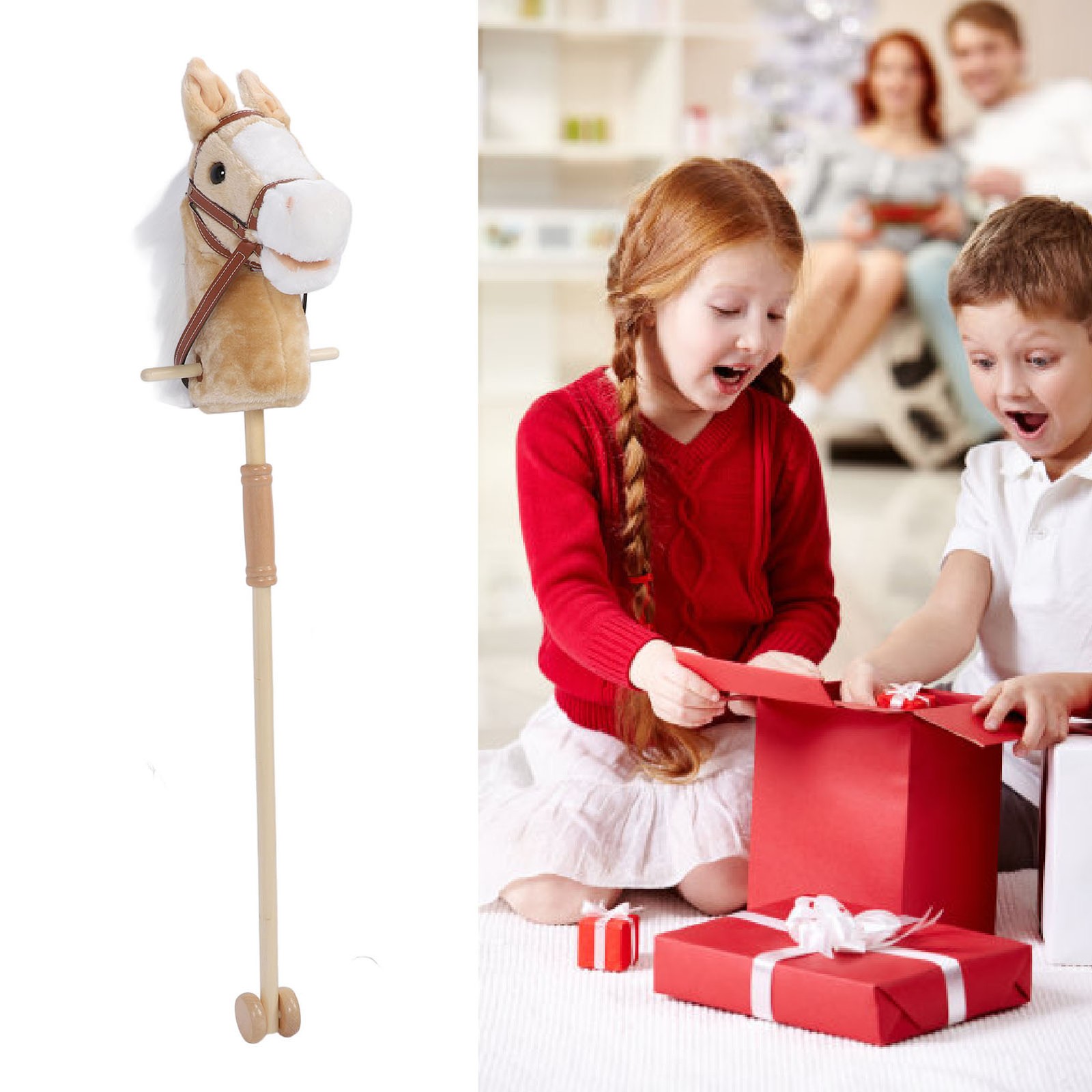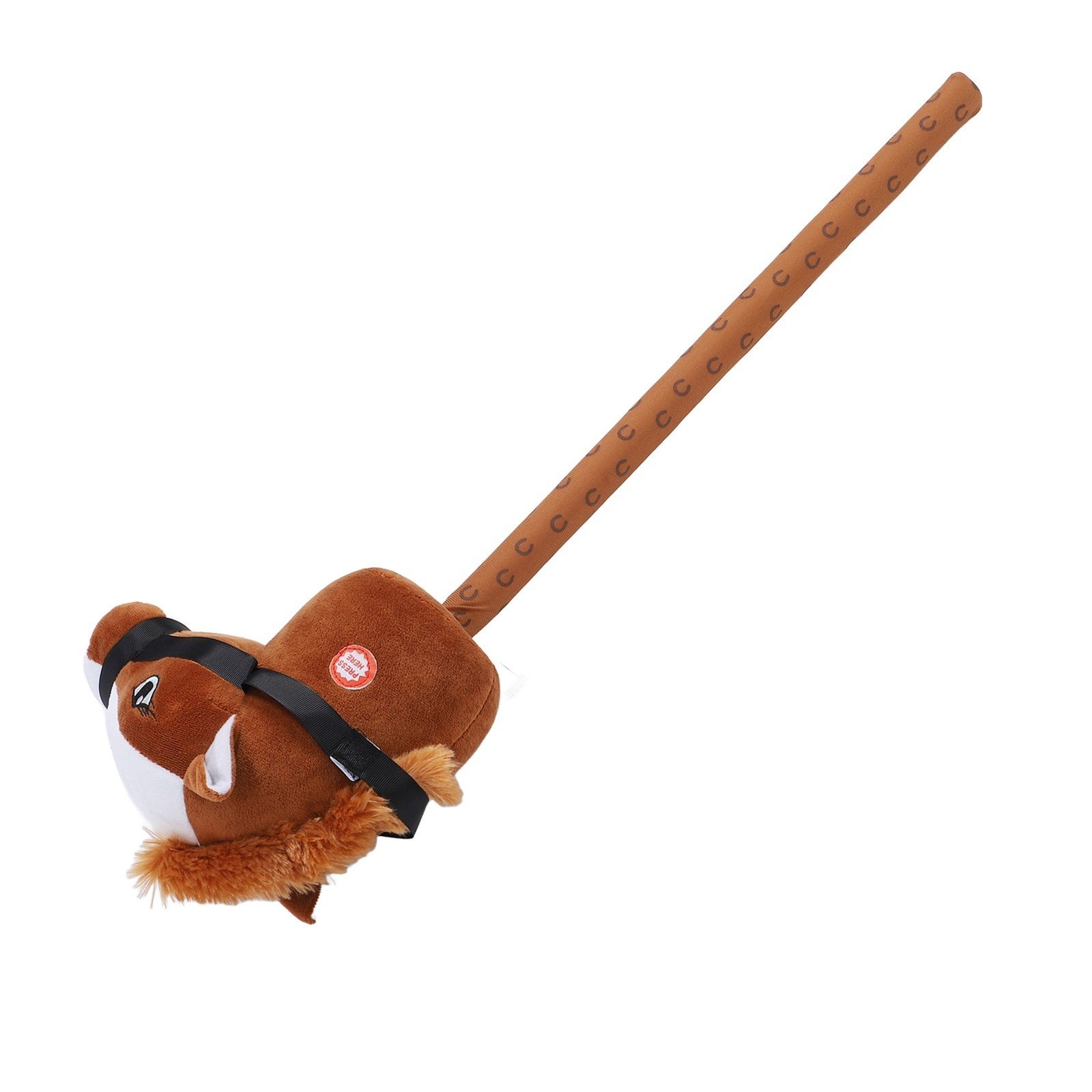 Fockety 28in Riding Stick, Outdoor Stick Horse with Wood Wheels Real Pony Neighing and Galloping Sounds Plush Toy Horse with Sound Toy (Light Brown with Black Hair)