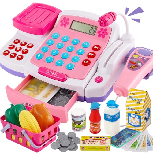 Dreamon Toy Till for Girls Boys 3 4 5 6 7 Years Old, Cash Register for Kids with Scanner and Music, Role Play Learning Toys Gift Toddler Toys Play Money Play Food (pink)