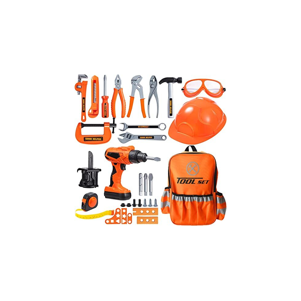 32Pcs Kids Construction Tool Toy Kit, Building Play Tools Kit Included Backpack Power Drill Chuck Saw Bits Helmet Wrench Pliers Screwdriver Tape