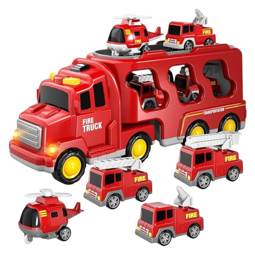 Jonuin 5 in 1 Fire Truck Toys, Fire Engine Toys with Light Sound, Toddler Trucks Toy for Boys Girls, Friction Power Car Carrier Transport Vehicle for Children