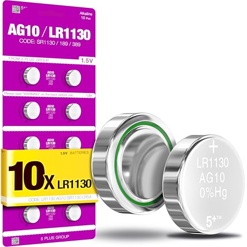 5Plus 10-Pack LR1130 AG10 SR1130 SR1131 389 390 LR54 189 387A 1.5V Button Cell Batteries – Alkaline Coin Batteries for Watches, Calculators, Toys, Remotes, Small Electronics