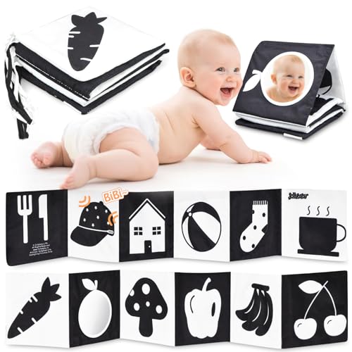 JoyLife Black and White Sensory Toys for Baby, Tummy Time Mirror Baby Cloth Books Montessori Toy with High Contrast Patterns and Teether Foldable for Newborn Infants Discovery Learnig 0-6 months