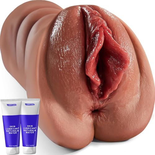 SoloFun 2 in 1 Realistic Male Masturbators with 3D Vagina Lifelike Realistic Textured Pocket Pussy Adult Sex Toys for Men Penis Stimulation Manual Masturbators Cup, Brown - Includes 2X 30ml lubes