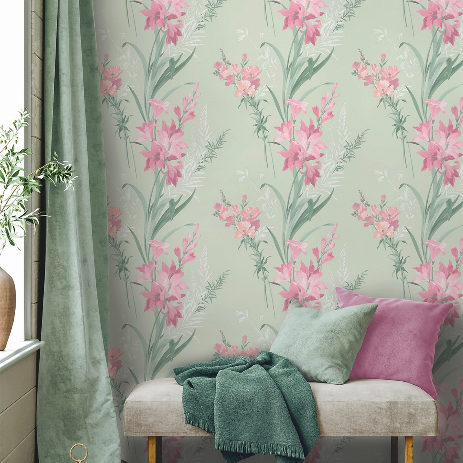 Sage Green Floral Wallpaper Pink Tranquil Garden Landscapes Feature Wall Smooth