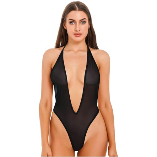 NewBull Women Sexy Lingerie Lace Tulle Splicing Babydoll Bodysuit Deep V Neck Blackless Shapewear Transparent Floral Teddy Leotard Ladies Underwear Naughty Nightwear Bikini Outfit (Black, L)
