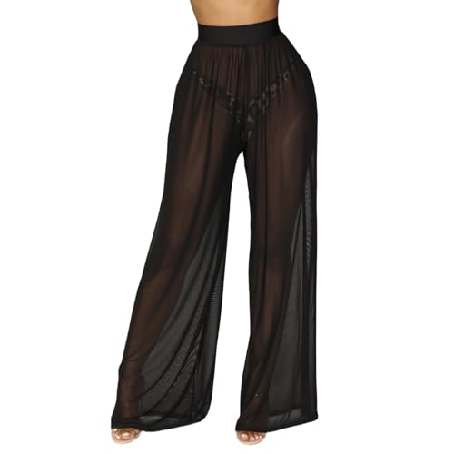 Hybursky Women's See Through Pants Sheer Mesh Summer Trousers High Waisted Loose Fit Casual Wide Leg Beach Pants Bikini Bottom Cover up Sexy Transparent Trousers for Club Party Dailywear, Black/M