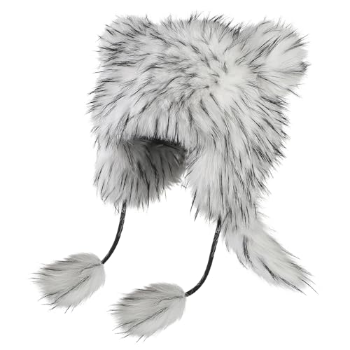 Faxianther Fluffy Faux Fur Bomber Hats With Cat Ear, Men Women Animal Theme Full Hood Hats Skull Caps Fancy Dress Party Cosplay Halloween Fox Wolf Costume Hat Headwear Earflap Hat Trapper Hat