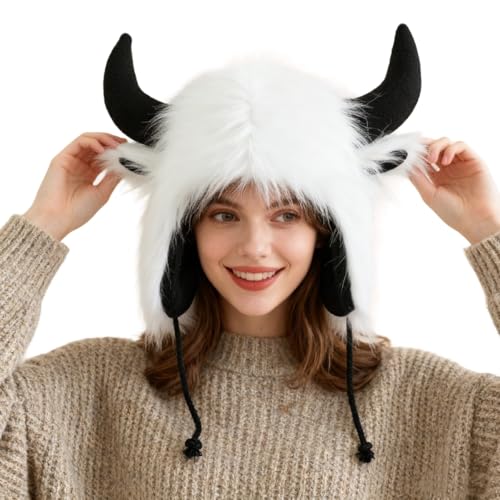 XINGYAOGJ Winter Faux Fur Horn Trapper Hat Warm Furry Bull Horn Earflap Hat Cute Windproof Plush Beanie Animal Cap for Cosplay Party Carnival Outdoor