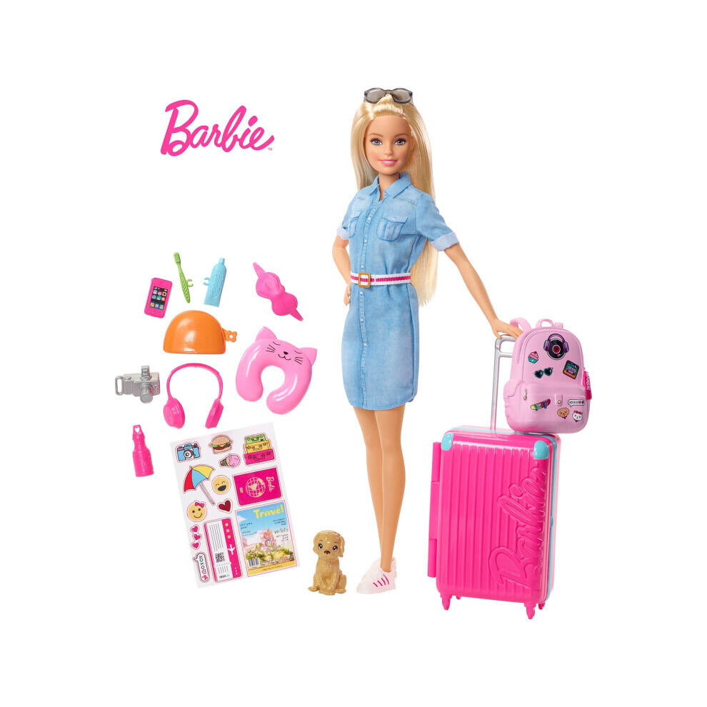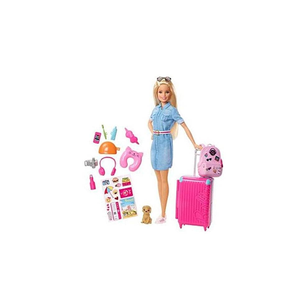 Barbie Travel Doll, Blonde, with Puppy, Opening Suitcase, Stickers and 10+ Accessories, for 3 to 7 Year Olds