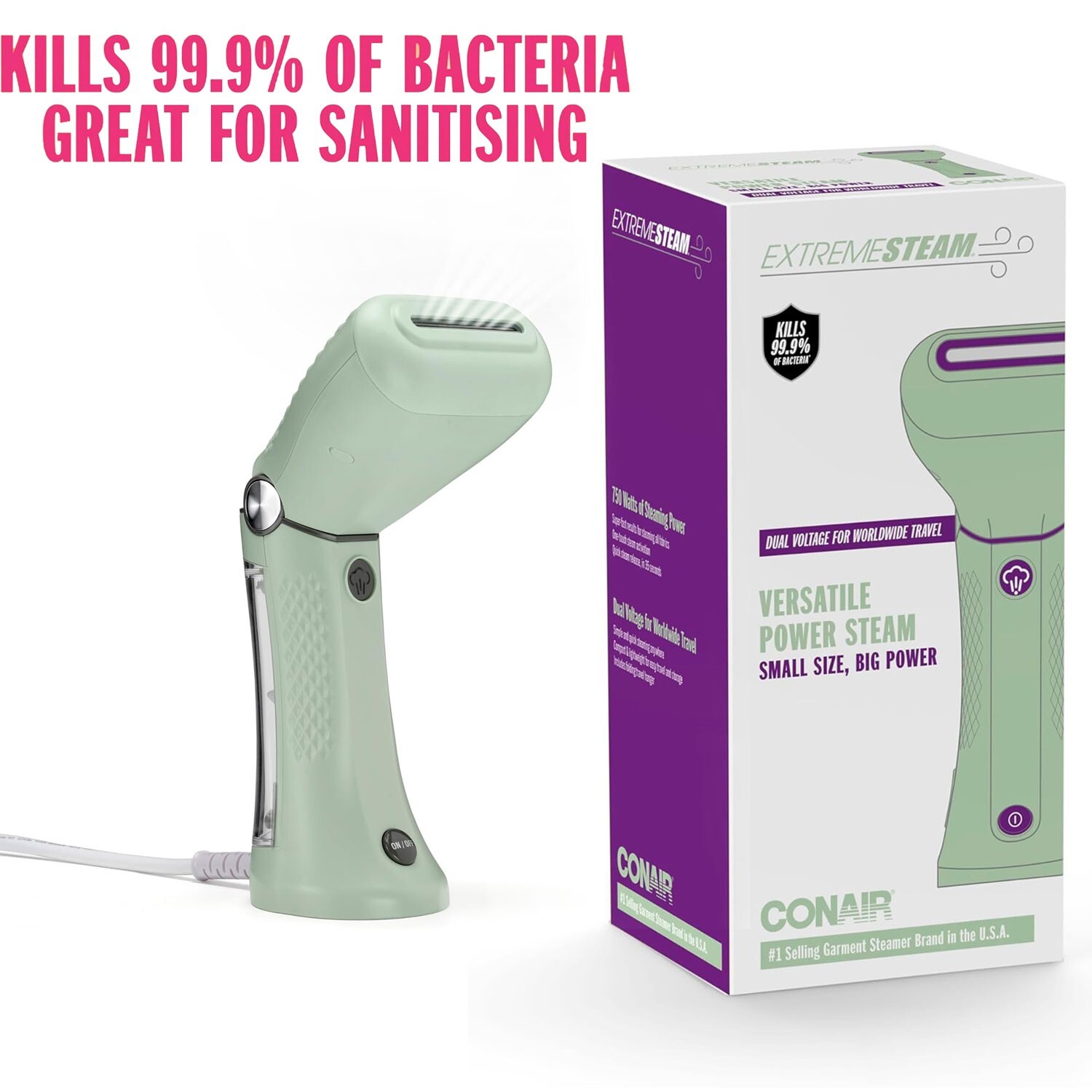 Conair Extreme Steam Handheld Clothes Steamer, 90ml detachable water tank, Fast 35 second heat up, Lightweight Travel Garment Steamer, Worldwide Use, Green, GSC24U, UK PLUG