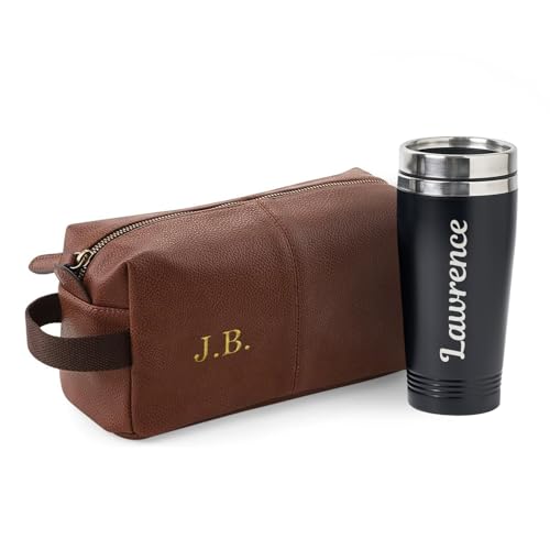 Personalised Embroidered Leather Wash Bag Gift Set with Engraved Travel Mug Coffee Present for Him, Dad, Brother, Brown