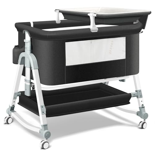 5 in 1 Baby Travel Cot, Foldable Bedside Sleeper with Bassinet Diaper Changer Mattress Lockable Wheels Hanging Toys Carry Bag, Portable Crib Playard Pack and Play for Newborn Infant Toddler (Black)