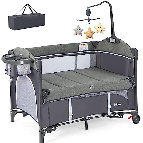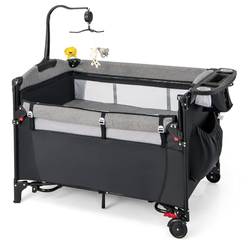 5 in 1 Baby Travel Cot, Foldable Bedside Sleeper with Bassinet Diaper Changer Mattress Lockable Wheels Hanging Toys Carry Bag, Portable Crib Playard Pack and Play for Newborn Infant Toddler (Gray)