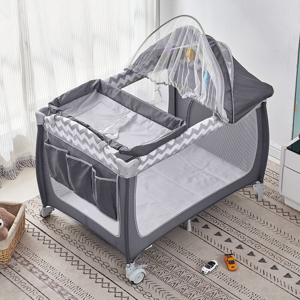 BonChoice Portable Travel Cot Crib Bed Playpen for Baby & Toddlers, Foldable with Wheels&Carry Bag, Nursery Center (Simple Grey)