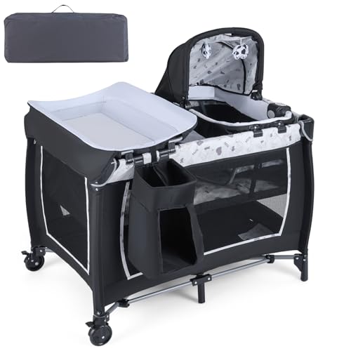 Baby Travel Cot, 5 in 1 Foldable Baby Beside Sleeper with Bassinet Diaper Changer Mattress Carry Bag Hanging Toys Music Box and Basket, Portable Crib Playard Pack and Play for Newborn Infant (Black)