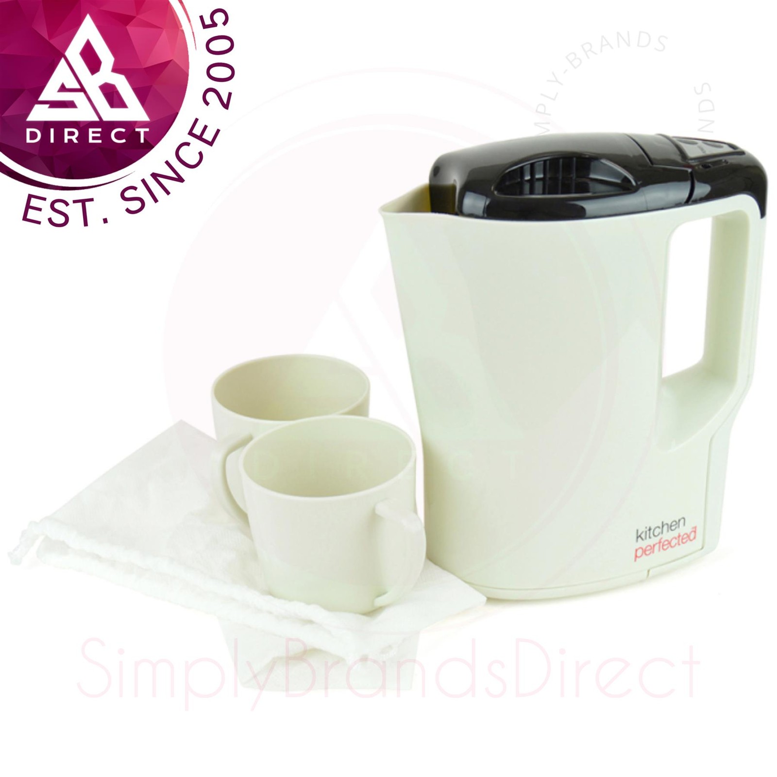 TRAVEL KETTLE + 2 CUPS 0.5 LITRE IN WHITE COLOUR DUAL VOLTAGE SMALL ELECTRIC UK