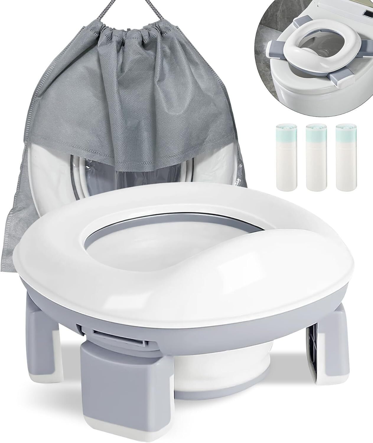 Orzbow Travel Potty for Toddlers,Portable Potty Training Toilet Seat with 4 Legs,Foldable Kids Toilet Seat with 40pcs Potty Bags,Detachable Carry Baby Potty with Splash Guard for Toddlers (Grey)