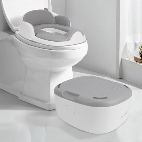 Potty Training Toilet Seat, 2 in 1 Potty Training Seat Adjustable Toddlers Potty Toilet Trainer with Steps Non Slip Handle & Soft Cushion Foldable Travel Toddler Toilet Seat for Kids Boys Girls, Grey
