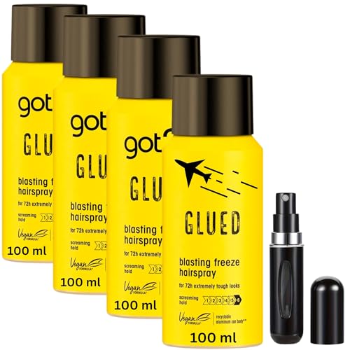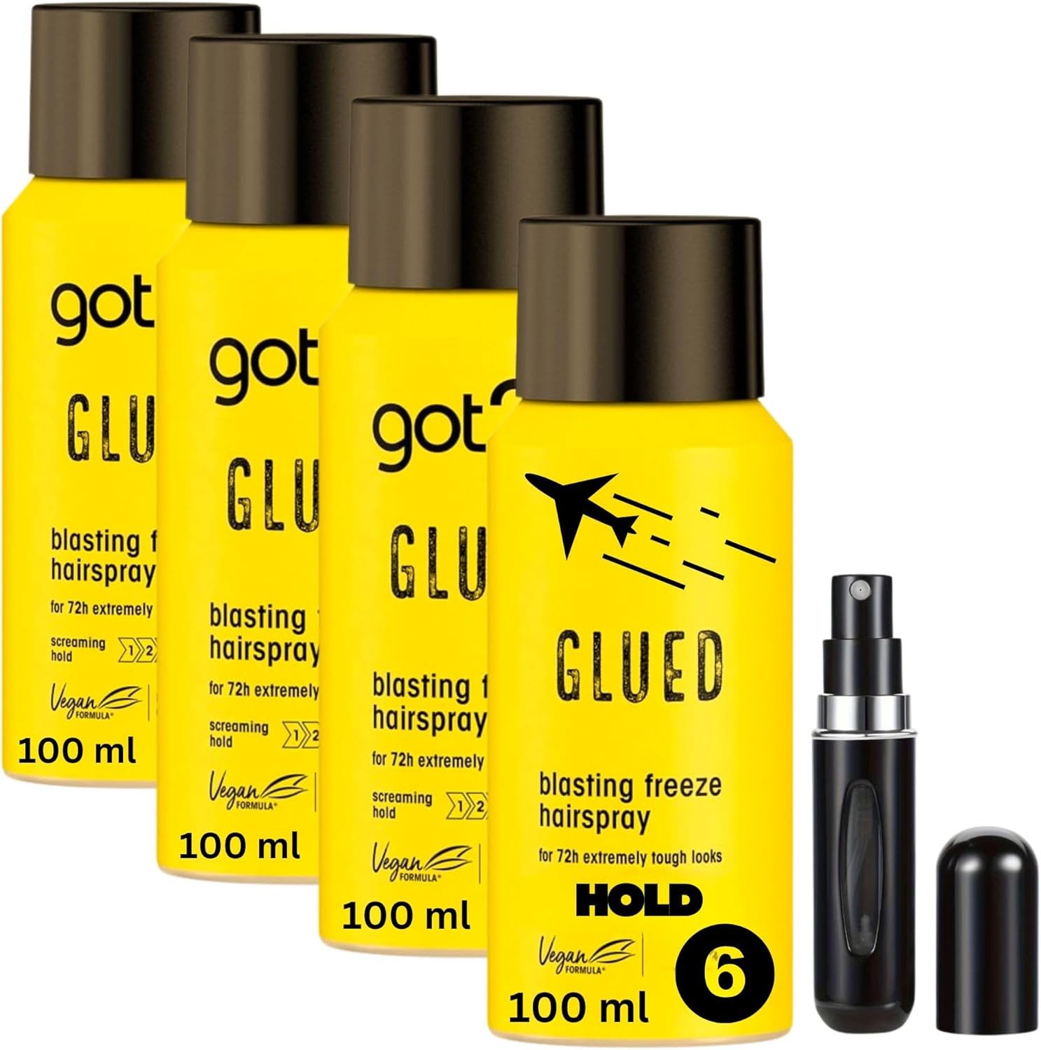 Travel Size Hairspray Bundle – Strong Hold Hair Spray with 4 x Got To Be Glued Hairspray (100ml Each) | Blasting Freeze Up to 72 Hours, Vegan, Silicone-Free and Wishesla Refillable Perfume Atomizer
