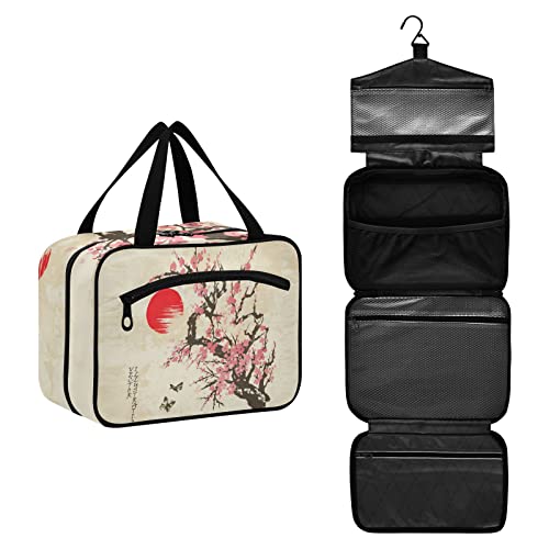 Vintage Red Sun Cherry Blossom in Traditional Japanese Style Women's Portable Makeup Bag with Handle Cosmetic Bag, Twill Cloth Travel Cosmetic Bag, Polyester Toiletry Bag for Women M Size