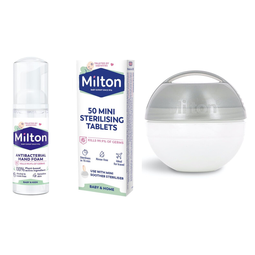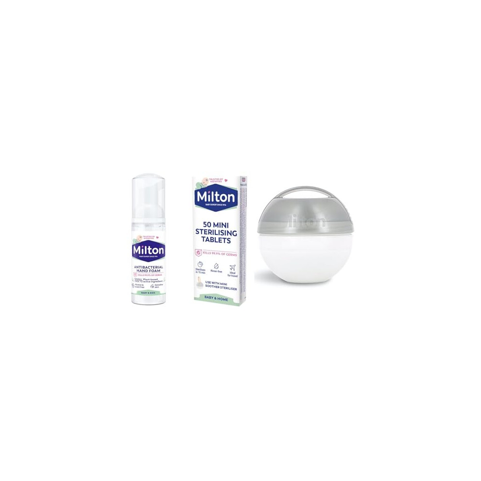 Milton Mini Soother Dummy Grey Travel Steriliser, 50 Mini Sterilising Tablets & 50 ml Hand Sanitiser. Out & About Bundle