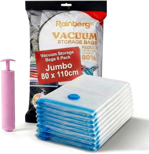 Rainberg 8 Pack Jumbo Vacuum Storage Bags, Home and Travel Vacuum Bags with Pump featuring Double Zip Seal & Triple Seal Turbo-Valve for Maximum Space Saving, Up to 80% More Space (80 x 110cm)