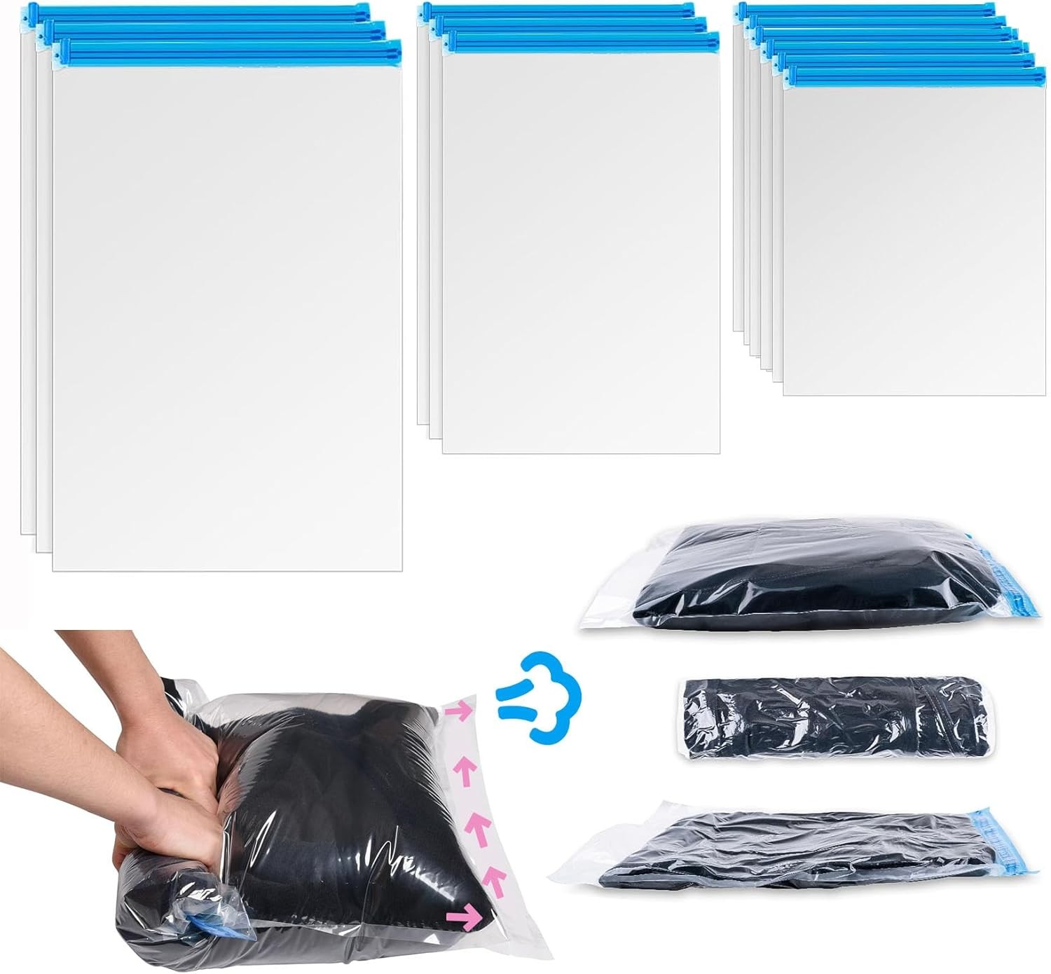 Vacuum Storage Bags - 12 Pack Reusable Strong Space Saver Compression Bags - Vacuum Pack Bags Double Zip Seal Travel Vacuum Storage Bags for Clothes Duvets Quilts Bedding(3Jumbo+3Large+3Medium+3Small)